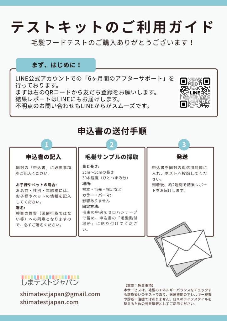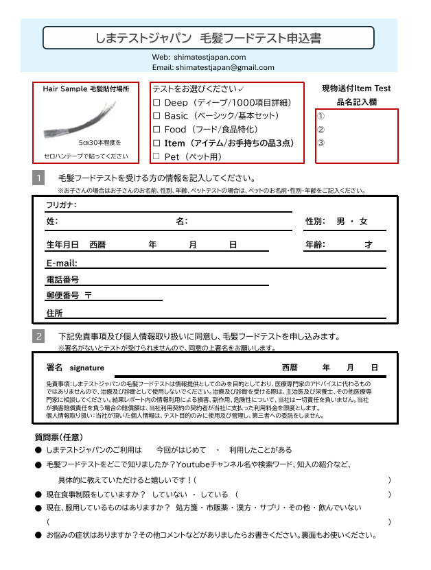 お申し込み書と封筒をダウンロードして、毛髪と一緒に送ってください。